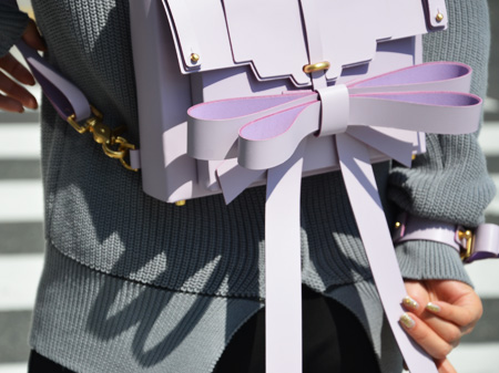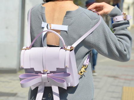 物だけ見ているとロマンチックで、少々非・現実的にも思える儚げなLilacのRIBBON BACKPACKですが、意外と普段のシンプルなスタイルに取り入れやすいな、と思いました。