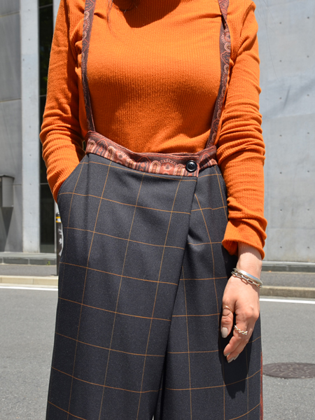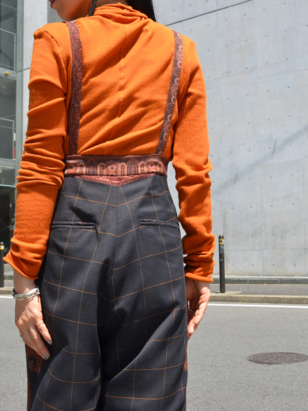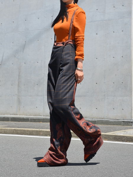 ブロックチェックとペイズリー柄を組み合わせたエレガントなプリントは、こちらのサスペンダーパンツのバージョンもあります。