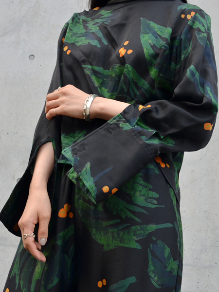 ダイナミックなリーフ柄はハンドスクリーンプリントといって友禅染の技法。