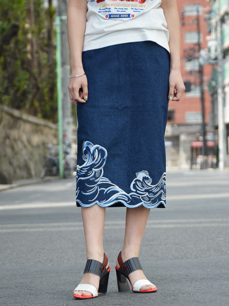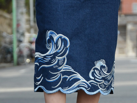 波のような、雲のようなウェーブが刺繍されていて、フロントはスカラップのようなカッティングが裾に施されています。