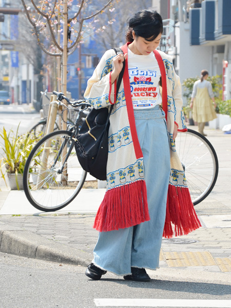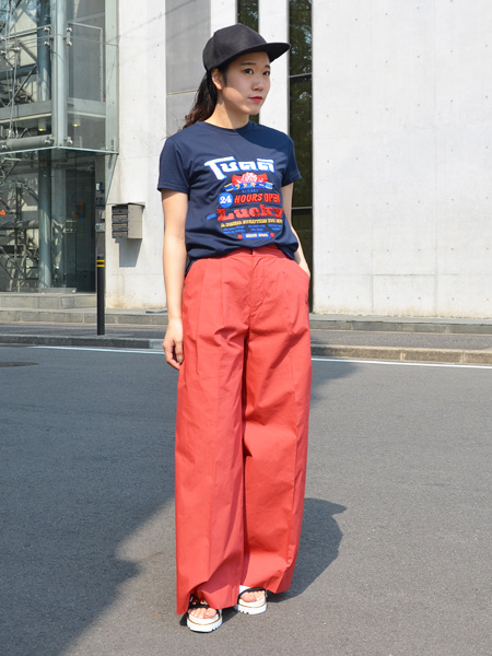 刺繍に使われている赤が目立つので、あえてボトムにも同系色を合わせて春夏らしい鮮やかなコーディネートをつくってみました。