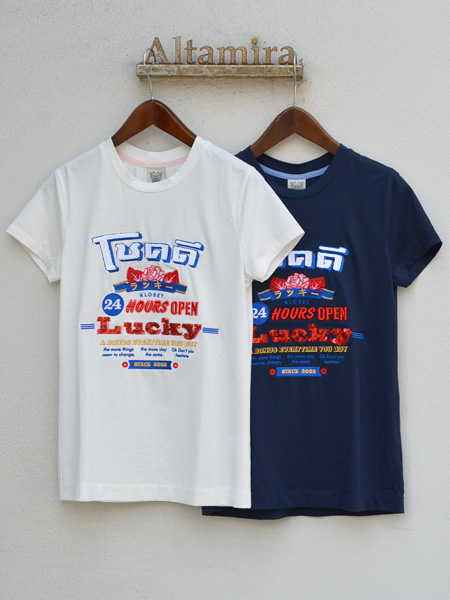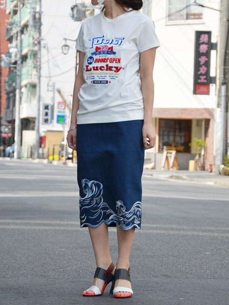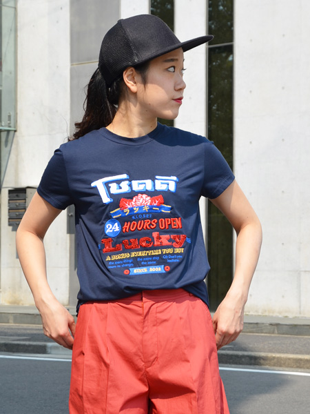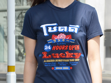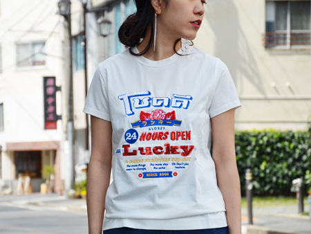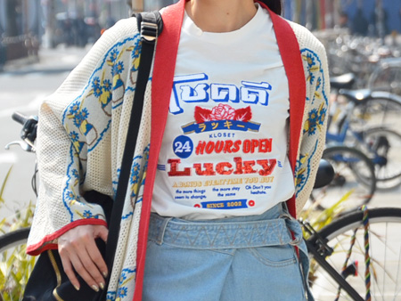 Tシャツって、アウターの下に着ると途端に存在感が薄くなるものが多いんですけど、このTシャツはどこまでも目立ってくれますし、わりと遠くからでもやっぱりカタカナのラッキーに目がいきます。笑
