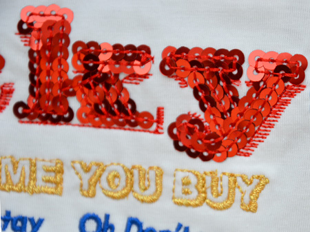 スパンコールと刺繍が施された、ユニークなメッセージロゴTシャツです。