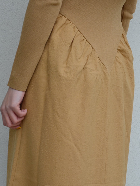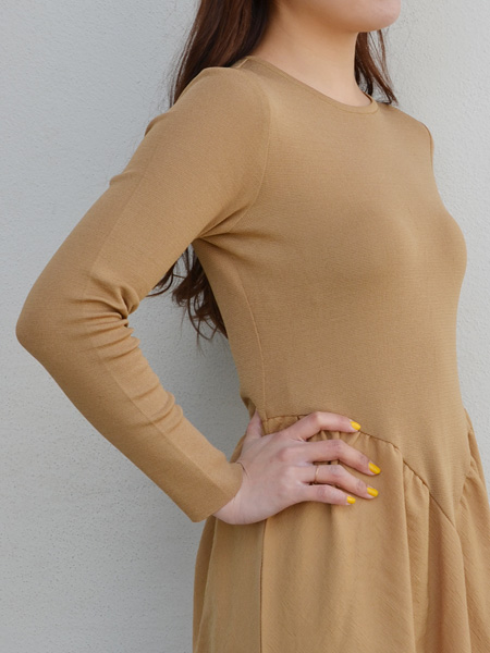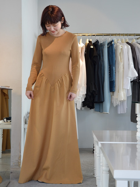 上半身をタイトに見せることでスカートの広がりが引き立つデザインになっているところもポイント。