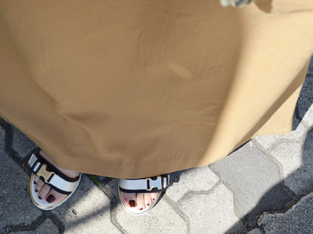 ズルッとルーズに着たてもらいたいワンピースなのでフラットなサンダルなどでわせていただきたい。個人的には歩くときに足先がちらっと覗く感じが好きです。