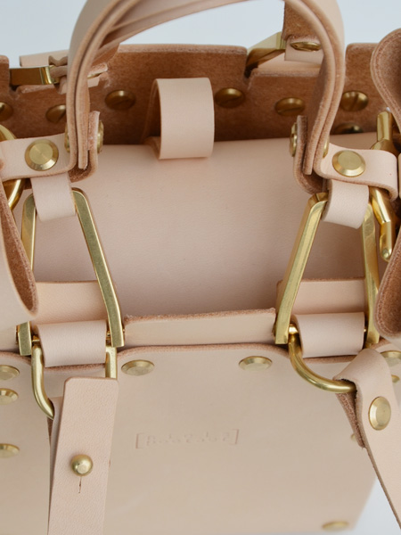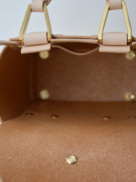 バッグ本体とハンドル部分を繋げるスクエアの金具パーツや、打ちつけられたゴールドのビスに目がいくデザインです。