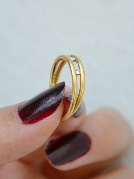 エンゲージリングは18Kイエローゴールドの1本のラインの造形を生かし、ダイヤモンドも極力ツメが目立たないようにセットしています。