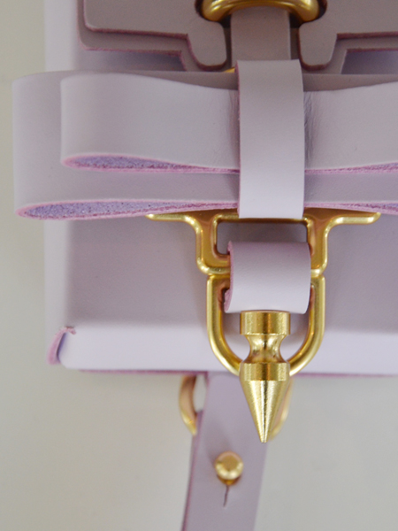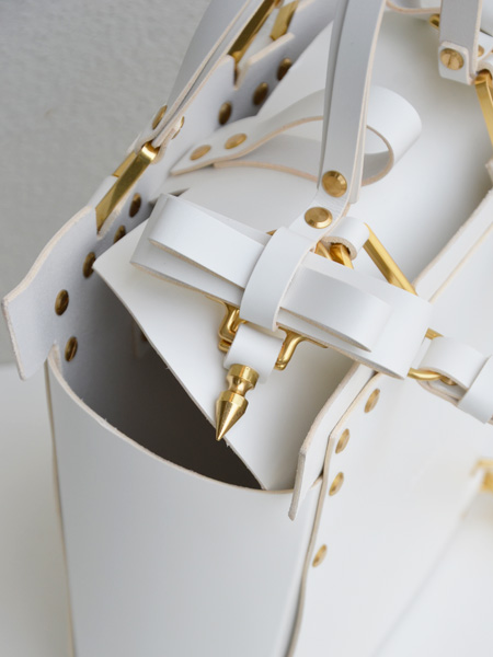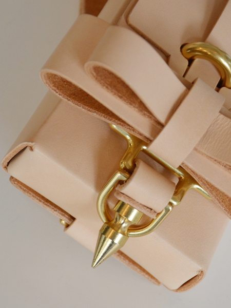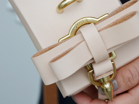 もう何度もご紹介させて頂いているので、説明は不要かもしれませんが、こちらのヌードのカラーはナチュラルレザーを切り貼りして縫い目を作らず、レザーを折りビスで留めてつくられております。