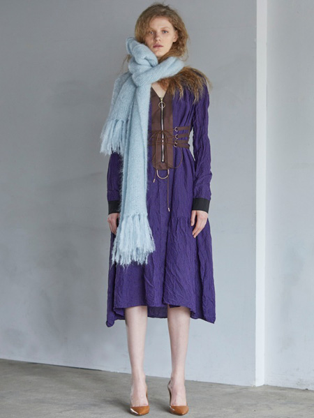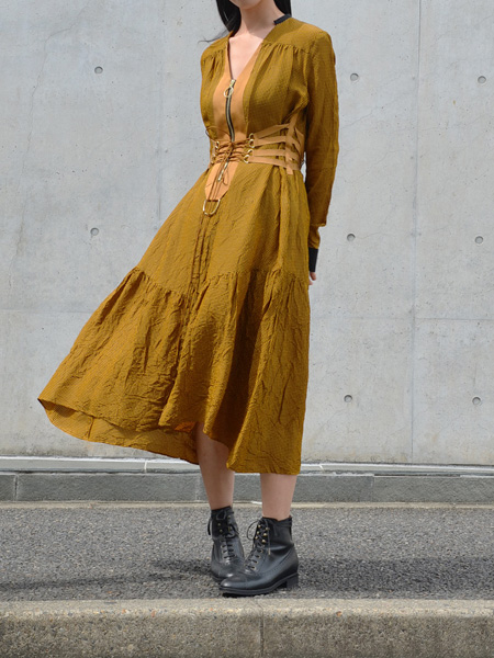 ストレートなシルエットのコーデュロイワンピースに帯のように結びつけられたベルトや、コルセットを思わせる、ワンピースのパーツの紐、股上の深いハイウエストのパンツなど、ウエストに制約を設けることで、服の動きや形をよりユニークな表情に仕上げています。