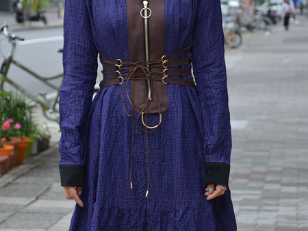 フロント、背中とレザーベルトに紐を編み上げていくようなデザインになっているのですが、