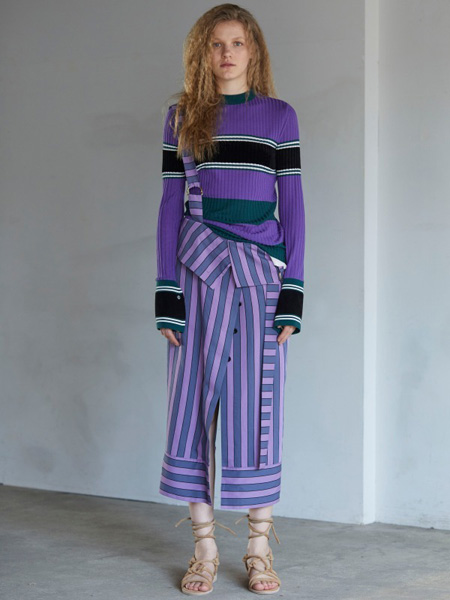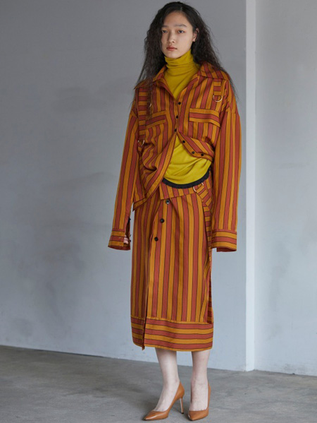 ストライプのスカートは着崩すことでより原始的かつ親しみやすい空気感を生み出します。