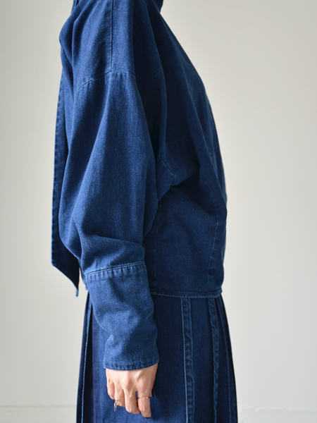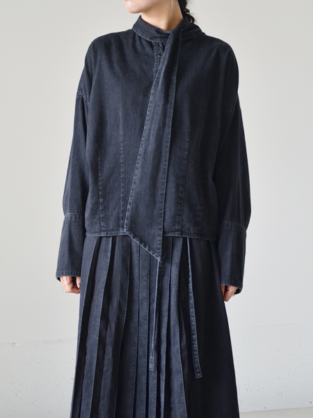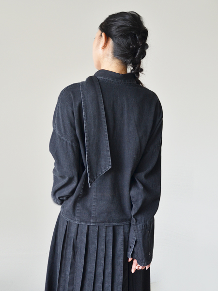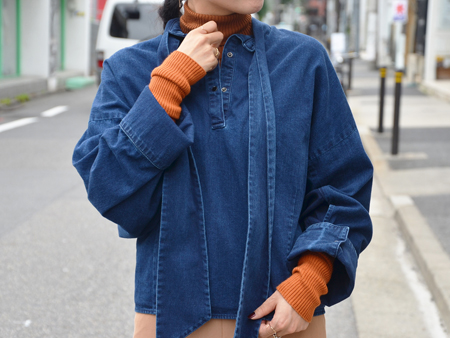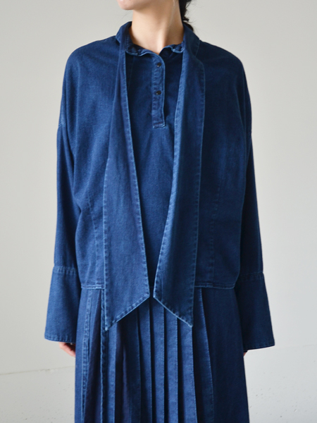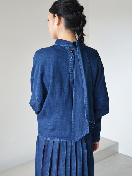 デニム素材のスカーフ付きシャツ。