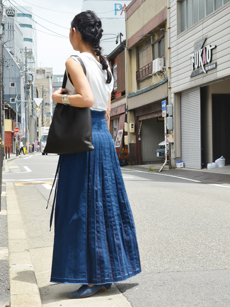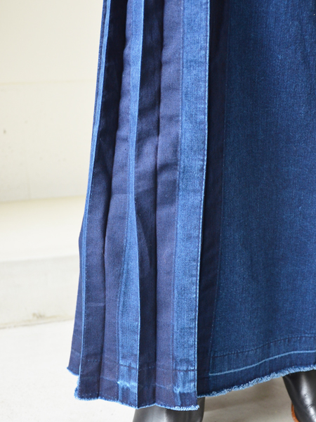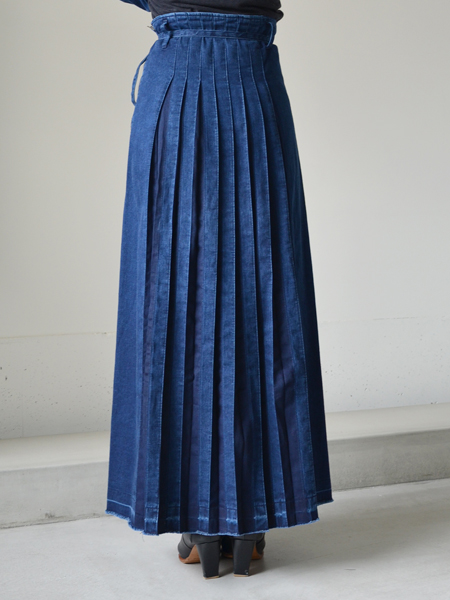 デニム素材のプリーツロングスカート。