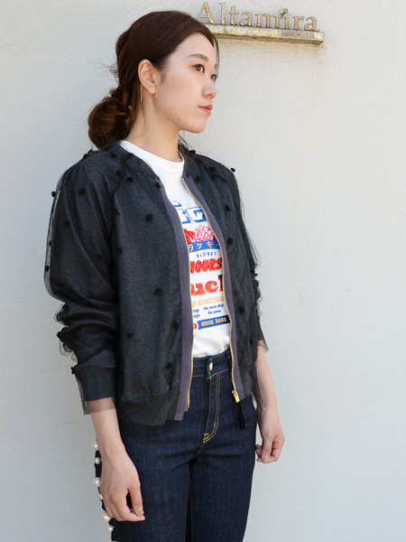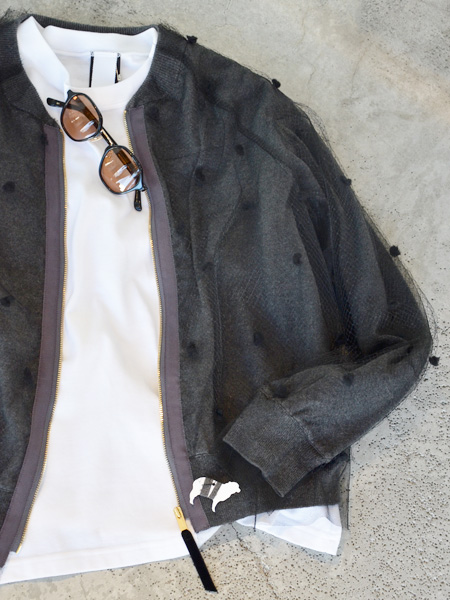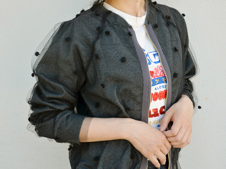 繊細なチュールが、カジュアルなジップアップカーディガンに可愛らしさをアクセント付けしてくれます。