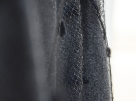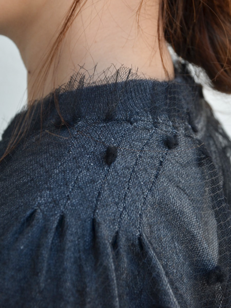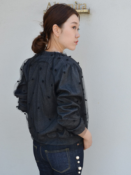 何が可愛いってこのカーディガン、チュールが贅沢にも2枚重ねてあり、着た時の立体感が面白い!チュールの上に乗せられたつぶつぶのドットのデザインも、身体を通すことでより活きてきます。