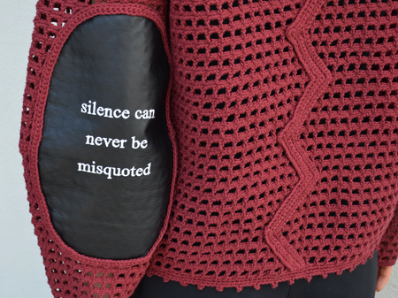 左側の袖には”沈黙を間違えることはない”というメッセージが刺繍されたレザーの切り替えが施されておりAKIRA NAKAらしいデザインでエッジが効いています。