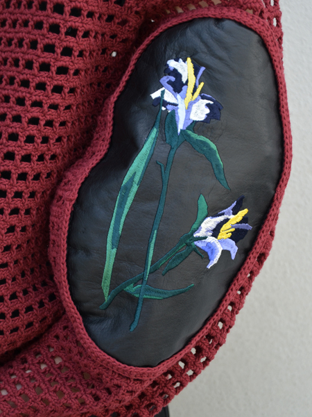 ハードなレザーに繊細な刺繍というギャップ。立体的な菖蒲は影もありとてもリアルに描かれています。