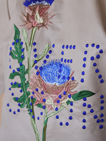 ブルーの刺繍糸の点で表現されたロゴは控えめで、アザミのお花刺繍とのバランスが良いデザインに。