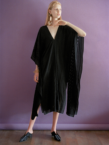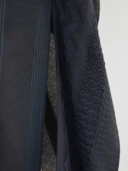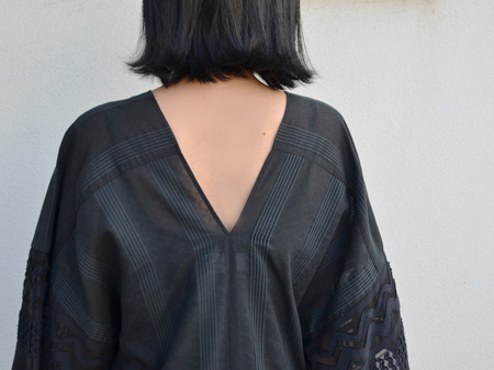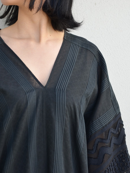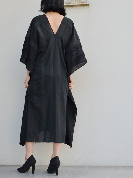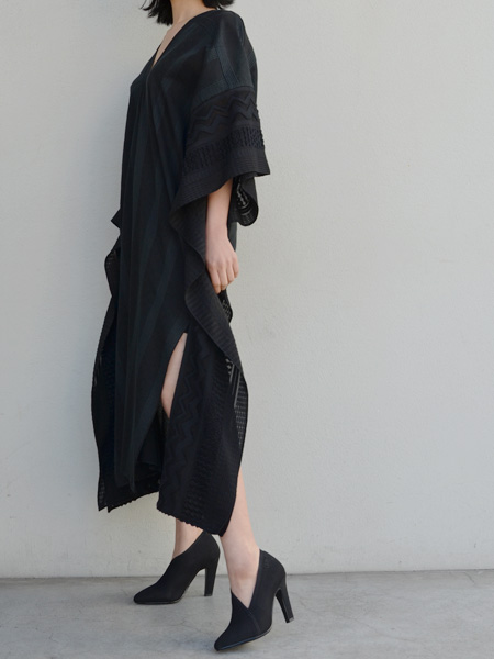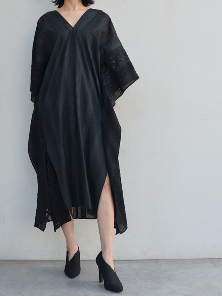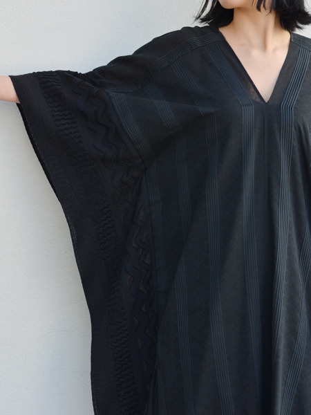 透け感のある薄手のテキスタイルに、独特の凹凸感のある風合いをもたせて柄を表現したポンチョ風のワンピース。