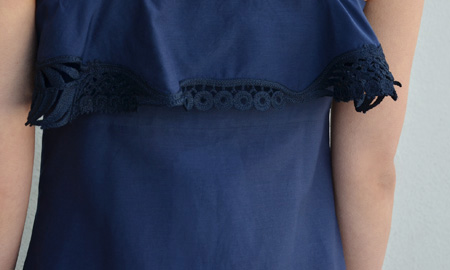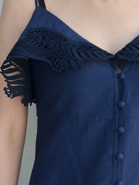 丸みのある胸元を美しく見せるカッティングに、クラシカルなレースのあしらいがエレガントな装いに。