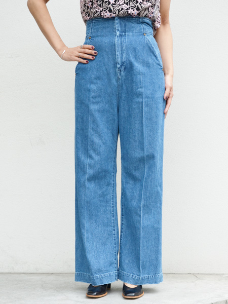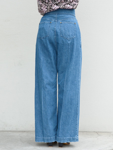 ベーシックなデニム地、メンズライクなアイテムでありながらハイウエストなので、ウエストにメリハリを効かせた女性らしいデザイン。