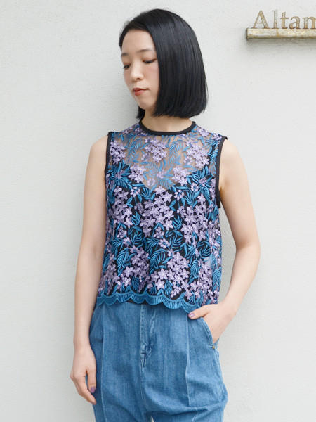 センシュアルなチュールレースのノースリーブに、ワイドデニムのコーディネートが個人的にもとても好み。