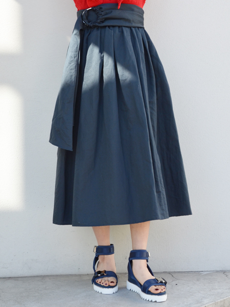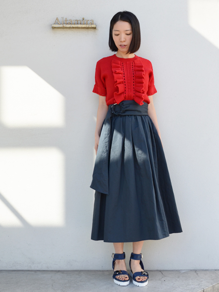スカートのボリュームに対し、ウエストはキュッと引き締まるメリハリのあるデザインのため、スタイルアップ効果ありです。
