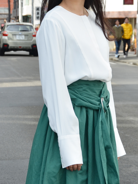 ノーカラーなのでかっちりしすぎないのですが、シャツ特有の洗練された雰囲気や上品さを、カジュアルなアイテムと合わせて楽しめます。
