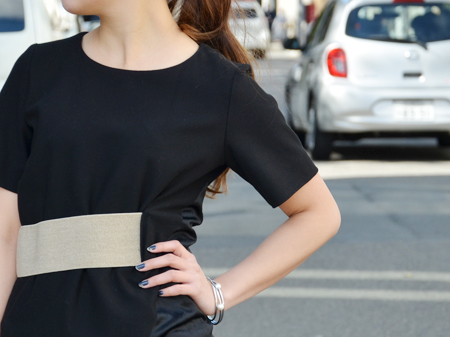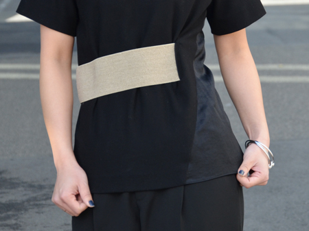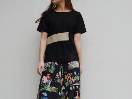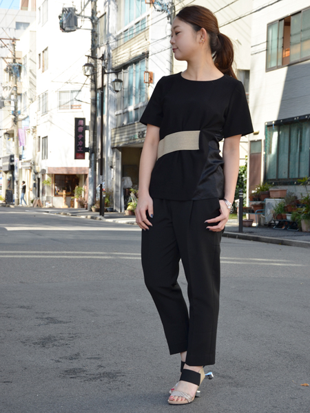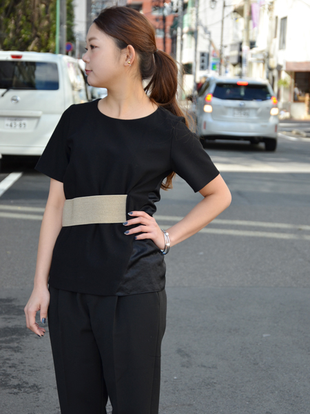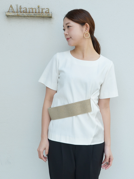 ウエストのゴールドのベルトがポイントになったトップス。