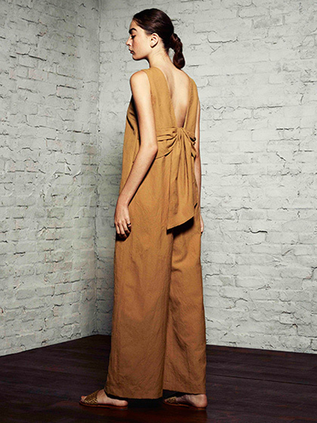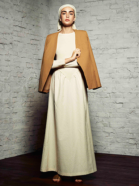 教会のドライな壁をイメージしたという生地は、ノーカラージャケットやオールインワン、そしてビスチェに姿を変える。センシュアルなバックスタイルや体に沿うラインでギャップを表現した。