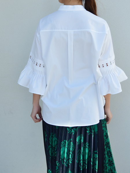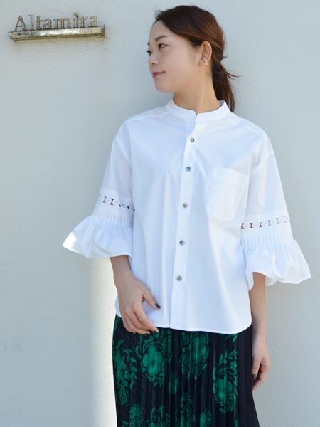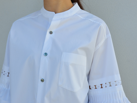 シンプルなシャツを、袖周りのデザインで魅せるアイテムです。