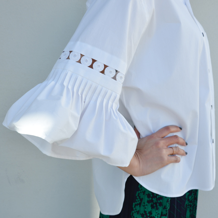 ストンとした身頃のボックスシルエットと、袖口にかけてのボリュームとの対比が新鮮。