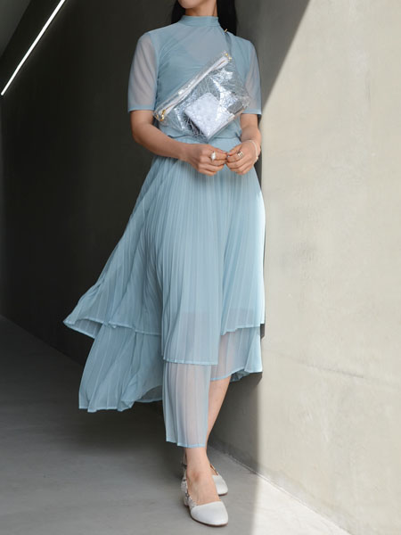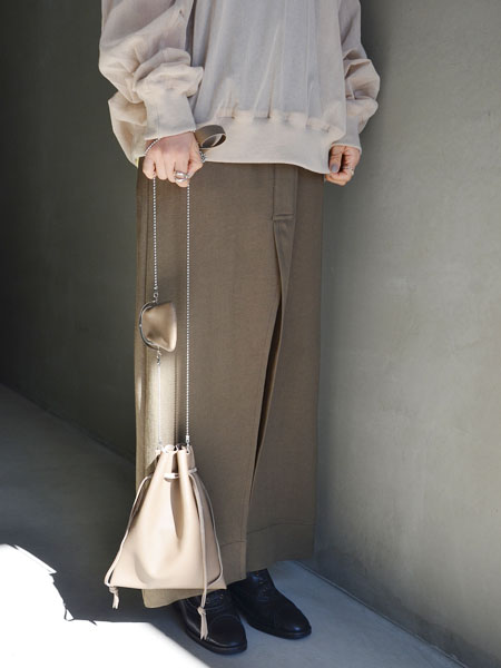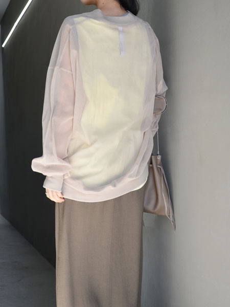 大胆なスリットが大人なスカートに、コットン地にオーガンジーを重ねたTシャツ。