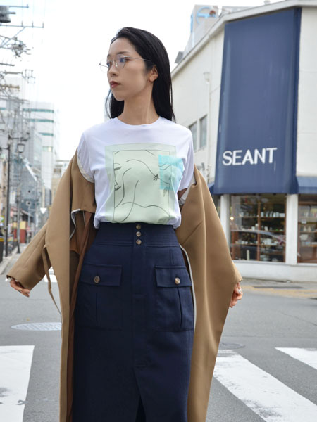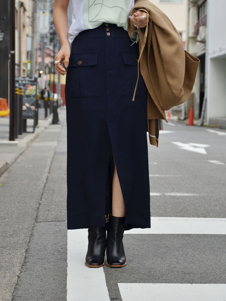 合わせているスカートは、先程 TAROHORIUCHIのTシャツに合わせていたネイビーのスカートと同じもの。