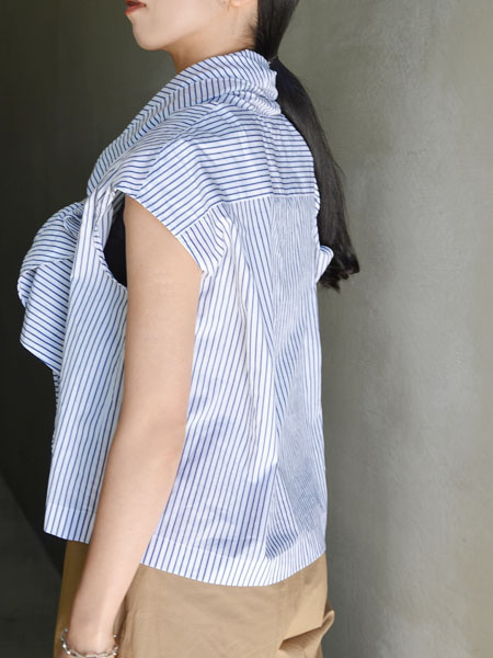首元で結んでもらうとストールを巻いたようなフレンチスリーブのトップスに。