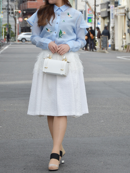 より軽やかにホワイトのフレアスカートに合わせてレディーライクに着てみました。