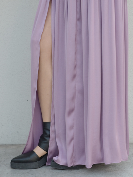 ロングの巻きスカートになっており、ウエストのボタン以外で留める部分はないのでこうして大胆なスリットになります。(スリットというよりもう全部見えてしまうので気を付けて下さい。)