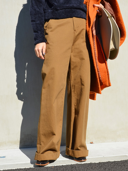 泥染めのハイウエストパンツは、程よい太さで履きやすいです。