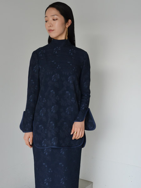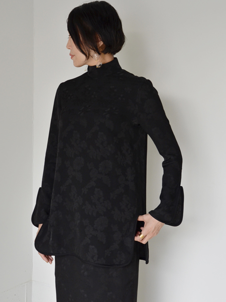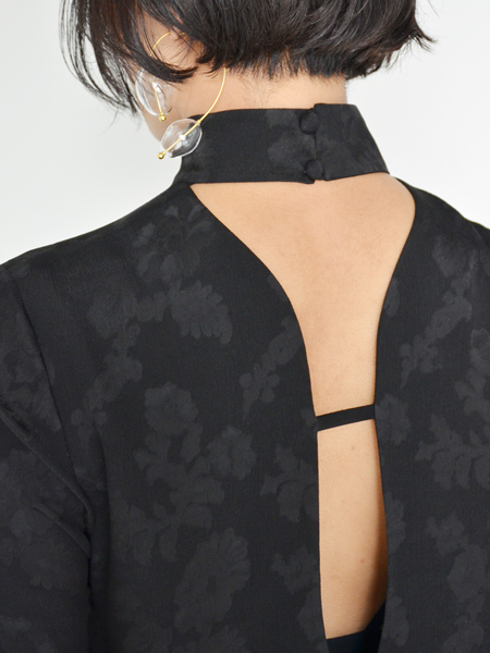 ”ヒップをすっぽりと覆う長めの着丈に、スタンドカラーがクラシカルでありながら、手元の所作を美しく演出するスリットに、バックスタイルの深い開きがフロントとのコントラストをドラマチックに演出する1着。”