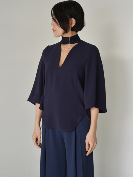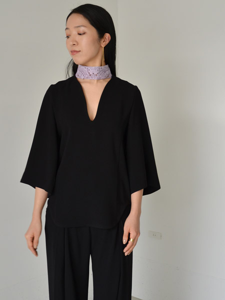 アールのついた深いVネックに、チョーカーのようなクロシェレースが印象的なオケージョンブラウスです。