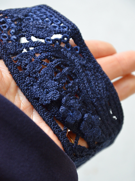 ネイビーのボディには同系色のクロシェレースです。