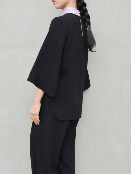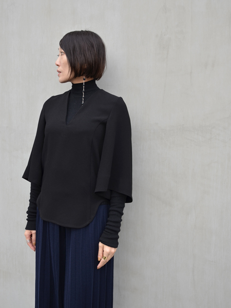 袖口に向かって広がりをみせる両袖はゆったりとした印象を与えながら、袖を通すことで女性らしいフォルムに沿うエレガントな雰囲気です。
