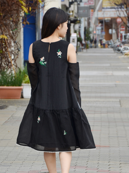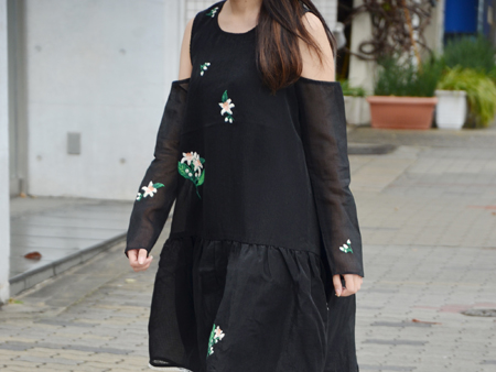 カットアウトショルダーが特徴的なAラインドレス。ZAYANらしいラグジュアリーな一枚。ハリ感のあるポリエステルのオーガンジー素材に、フローラルの刺繍、サイドと裾にシルバーのパイピングが施されています。