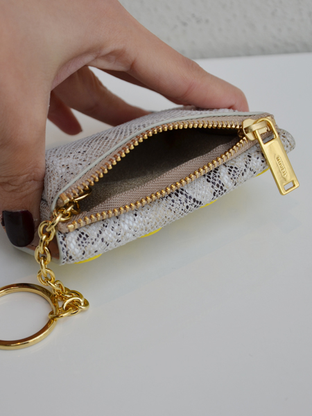 チェーンについたリングに鍵をつけ、使わない時はジップを開けて収納できます。
