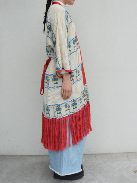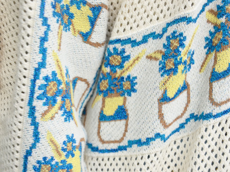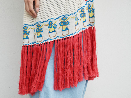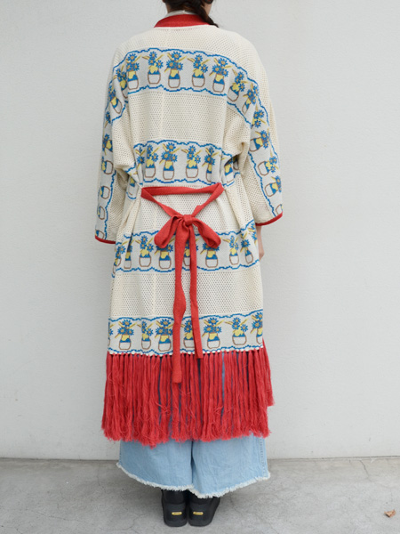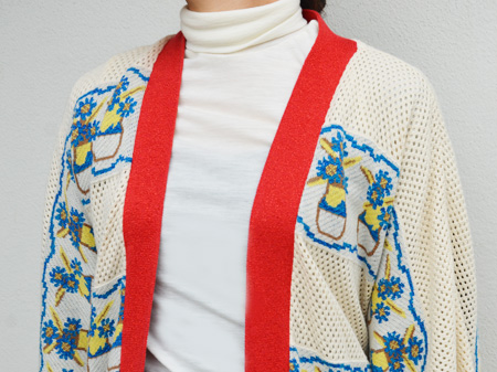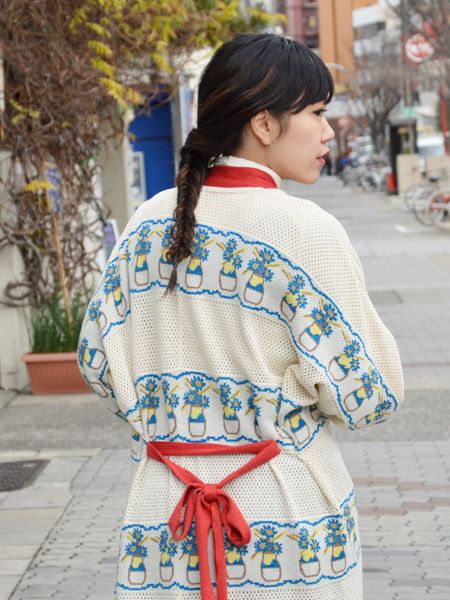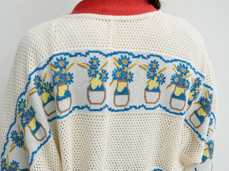 独特な花瓶のお花柄とほっこりレトロなかぎ編みで、柔らかな印象に。