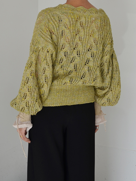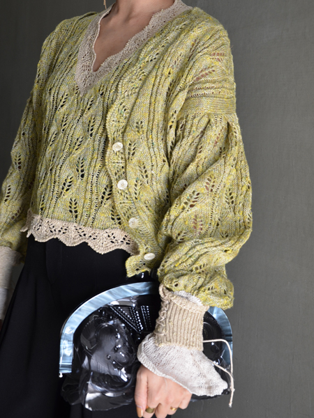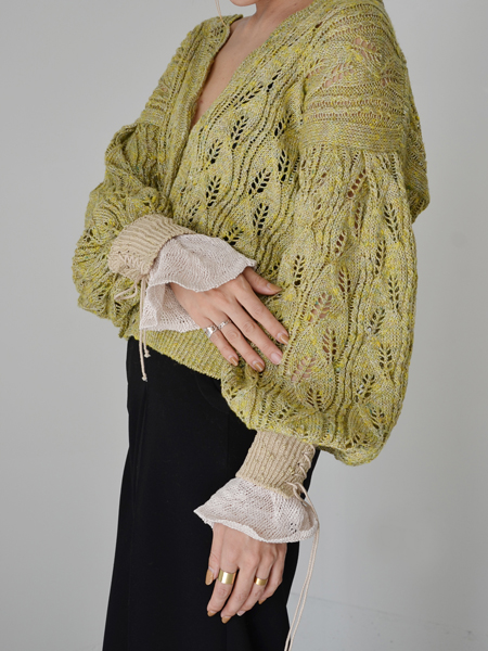 腕はぎゅっと絞りが効いていて、レースアップの紐からまた違うニットがひらひらと付いています。