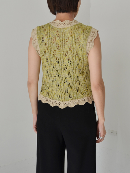こちらは鍵編みのフリルが袖と裾にあしらわれたノースリーブニット。