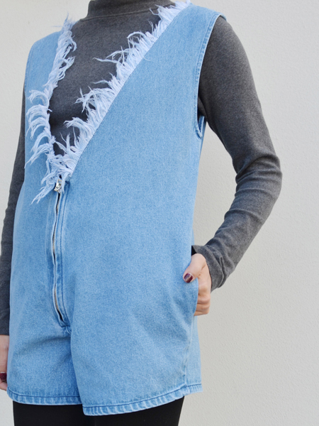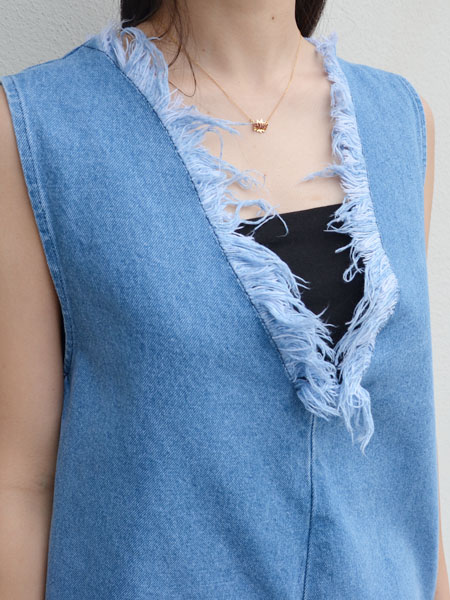 深めのVネックはカットオフされたままのフリンジがPONYSTONEらしいクールな表情に。