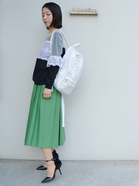 MUVEILのパールのリュックでカジュアルダウンしてもカラーがホワイトなので、モードなコーデに仕上がります^^