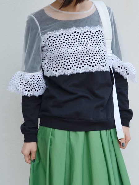 透け感のある素材と袖についたフリルがフェミニンな印象。
